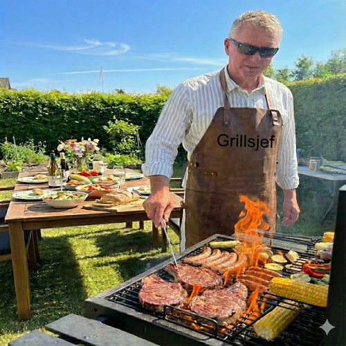 Grillforkle, vinforkle, kjellermester forkle... i ekte skinn med brodert navn, BBQ, grillsjef, etc.