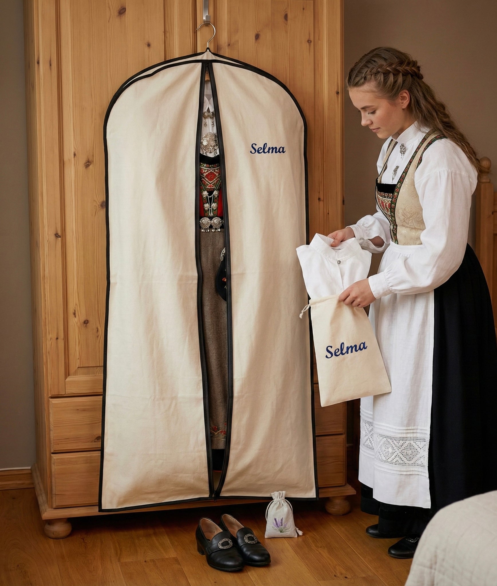 1 stk bunadspose, 1 stk skjortepose og 1 stk skopose med brodering. Alle er 100% bomull som puster. Alle blir brodert med samme farge på tråden.