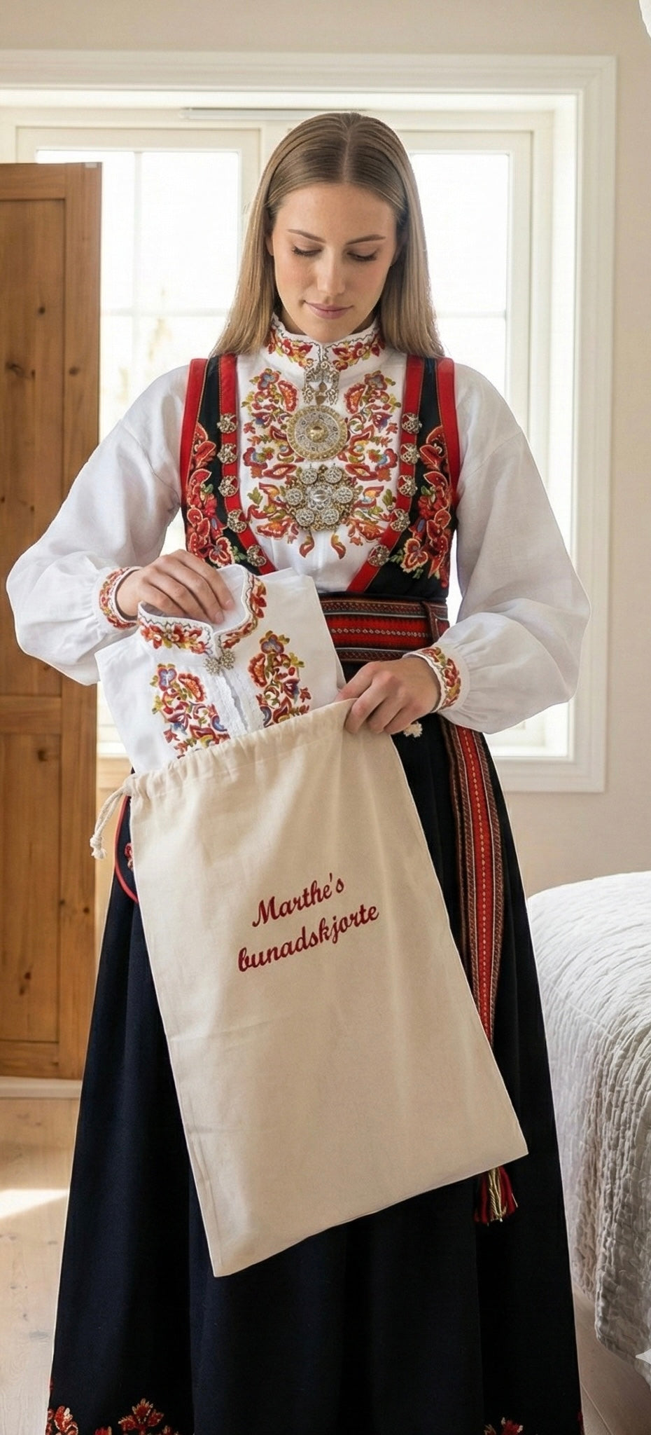 Bunadsposen/dresspose: I bomull, brodert med kvalitetstråd fra Madeira som tåler 95 graders vask.