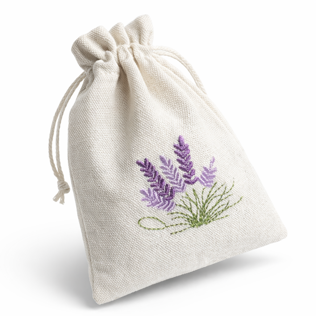 Brodert motiv av lavendel. Bomullspose med knyting i topp.
