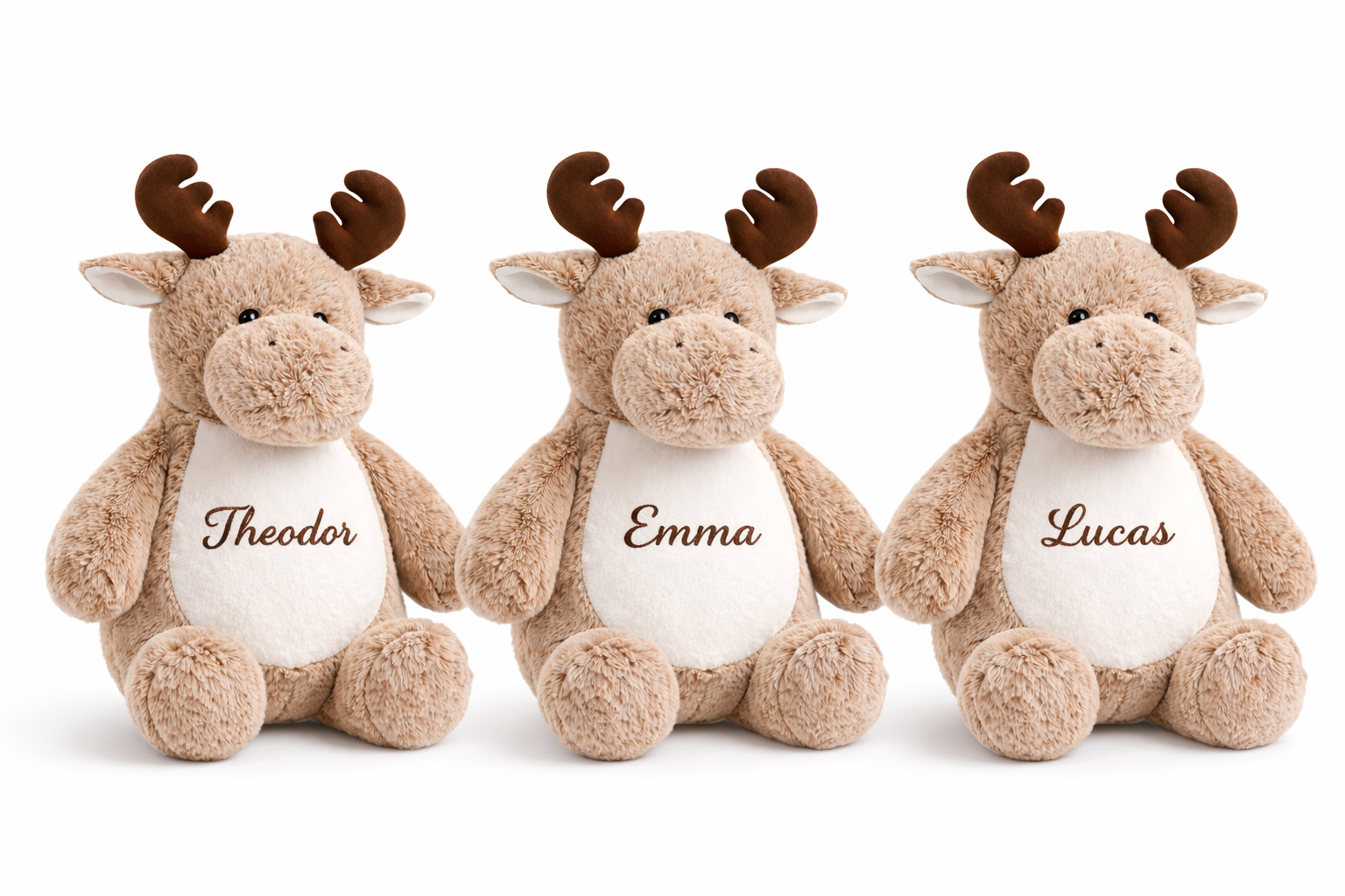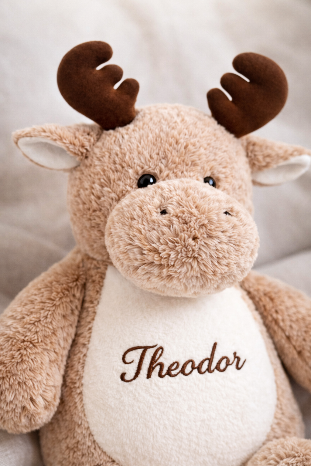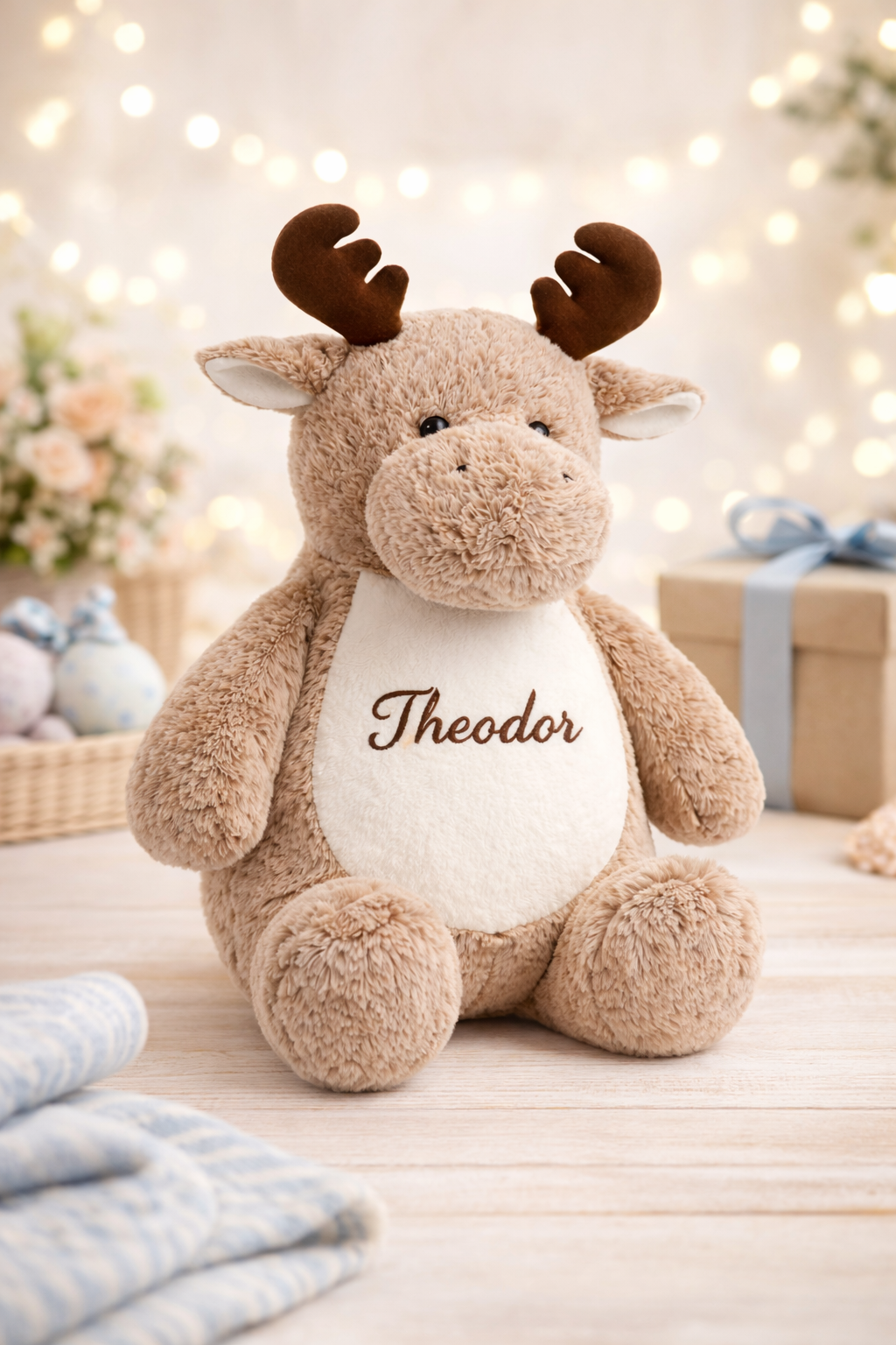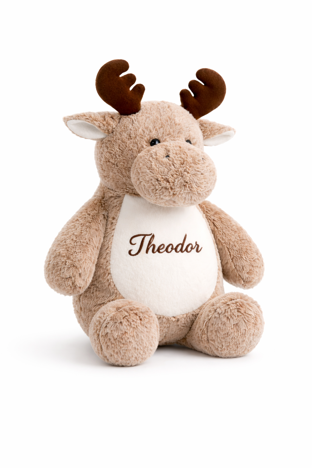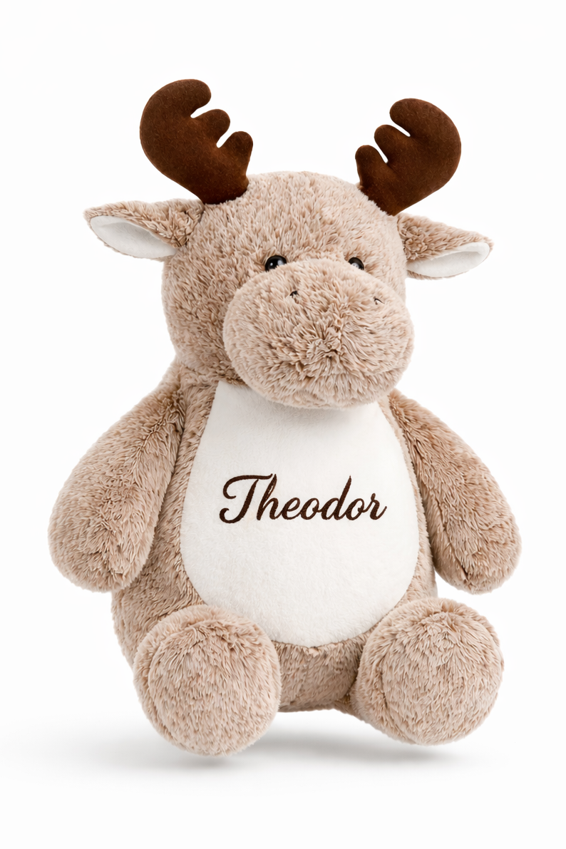 Denne koselige elg-bamsen blir helt unik med valgfritt navn brodert direkte på magen.