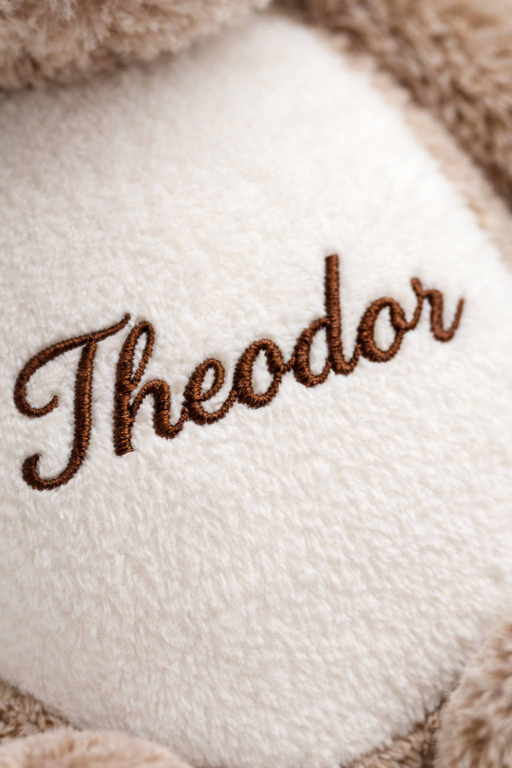 Broderingen er utført med slitesterk tråd i en elegant skrift, og gir bamsen et eksklusivt og personlig preg.