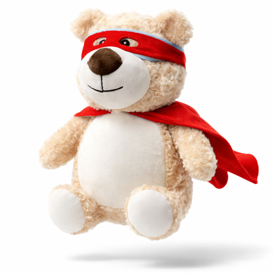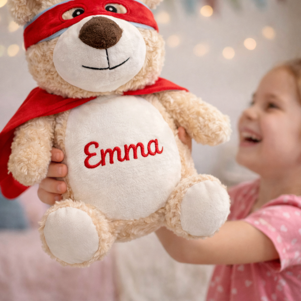 Denne koselige myke bamsen blir helt unik med valgfritt navn brodert direkte på magen.