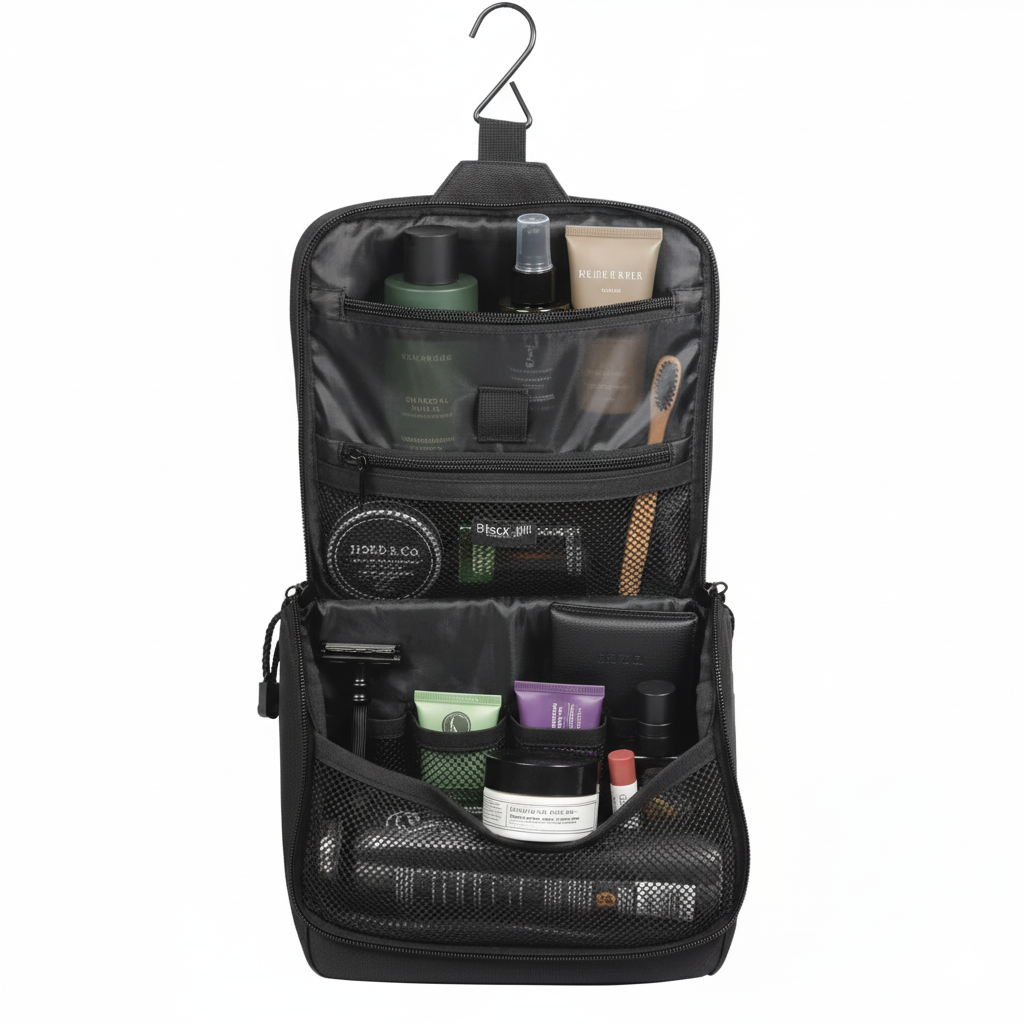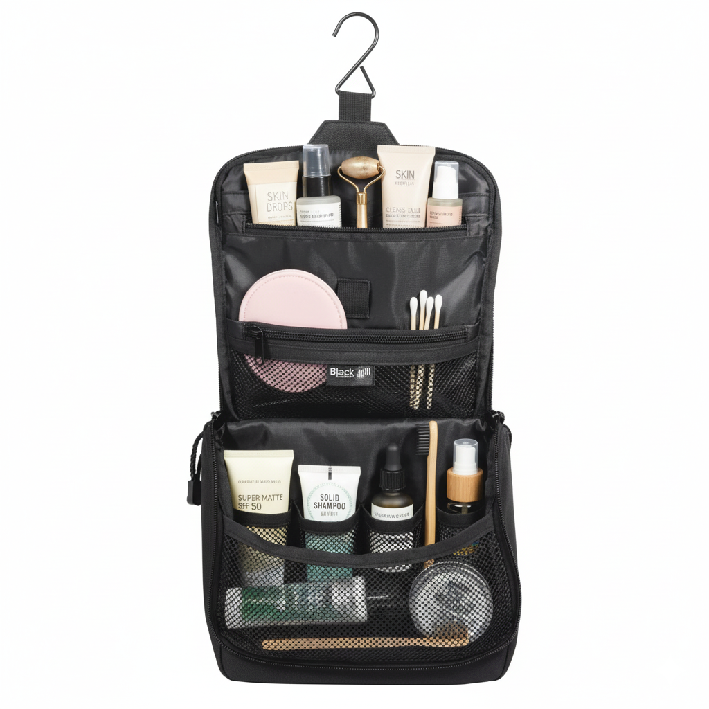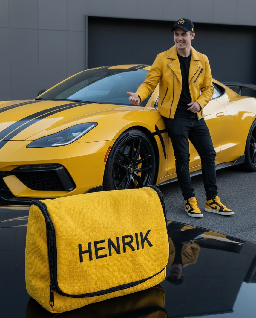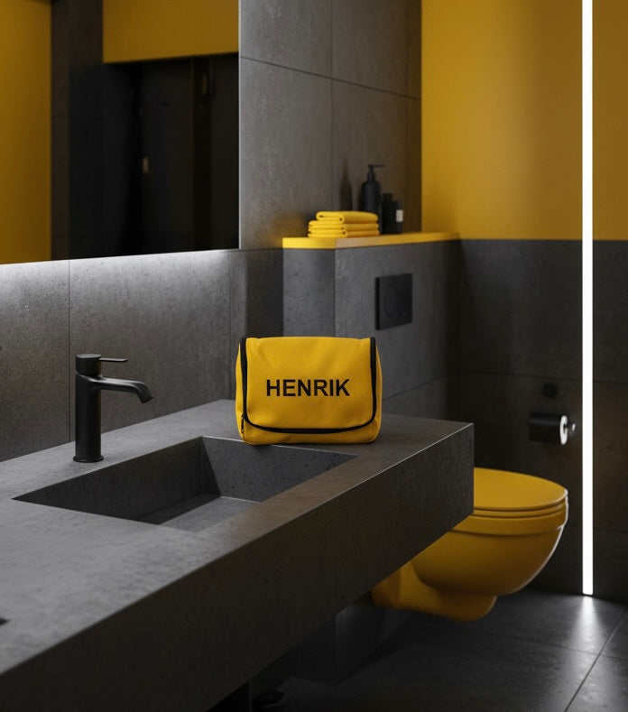 Denne lekre toalettvesken i solid, sort og gul nylon har mange smarte rom, sterke glidelåser og praktiske mesh-lommer som gjør det enkelt å finne frem. Den kan henges opp på badet, i garderoben eller på hotellrommet – perfekt når du vil ha alt lett tilgjengelig.