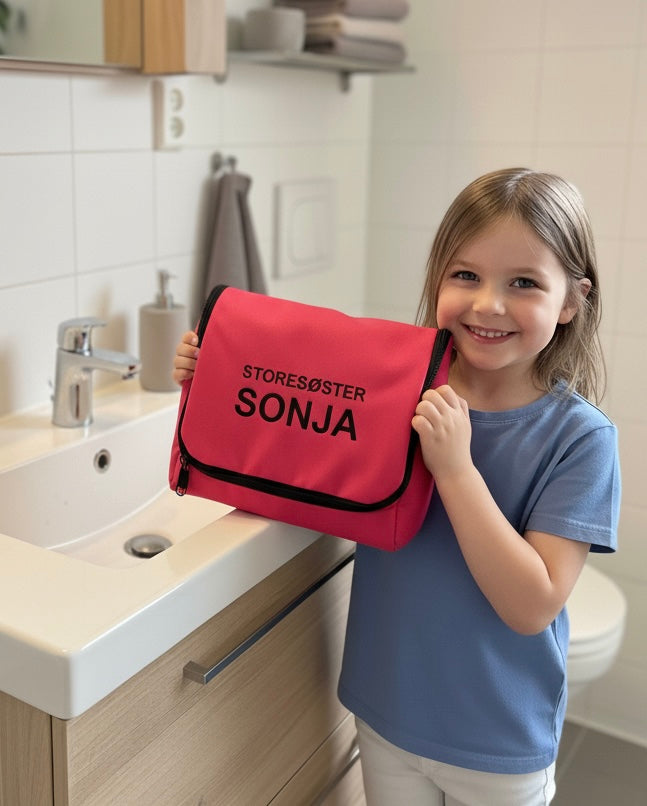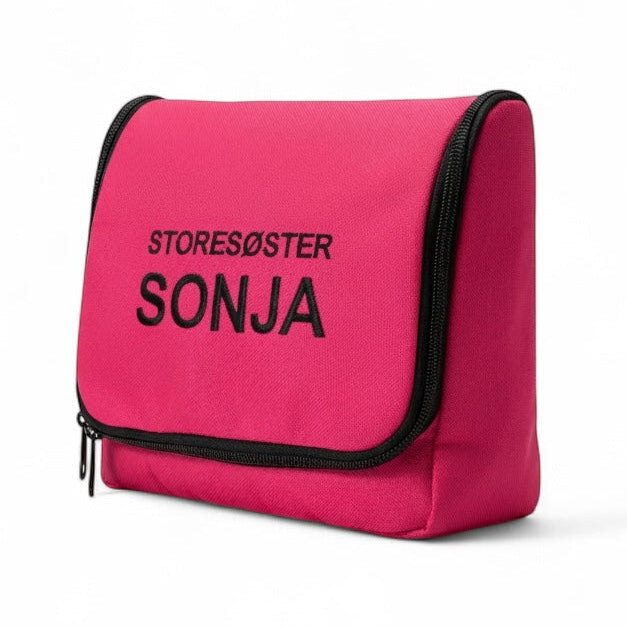 Rosa toalettveske brodert med det navn du ønsker. Det kan være navn, kallenavn, feriested osv. Ekstra navn eller ekstra linje koster 29,-.