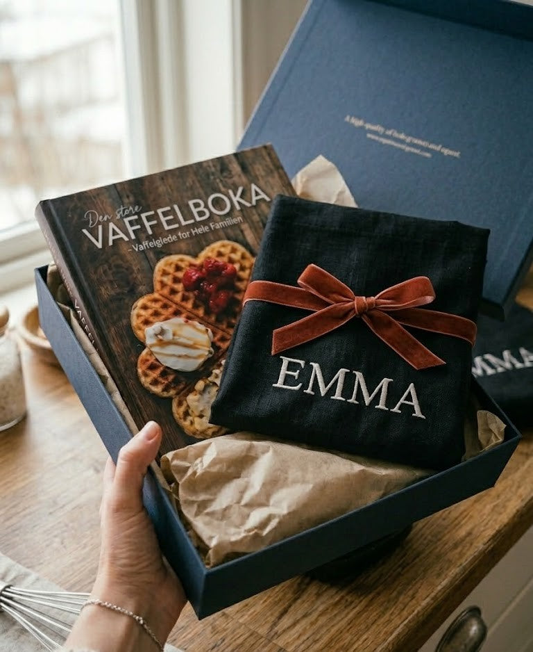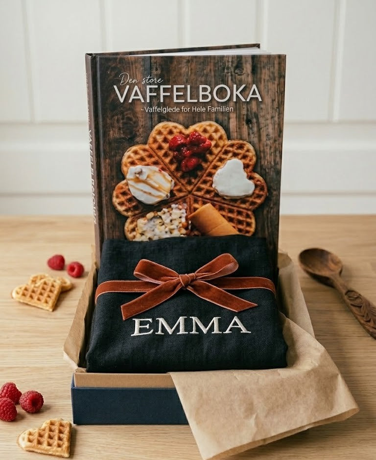 Pakke med den store Vaffelboka og forkle med brodering til spesialpris kr 499,-